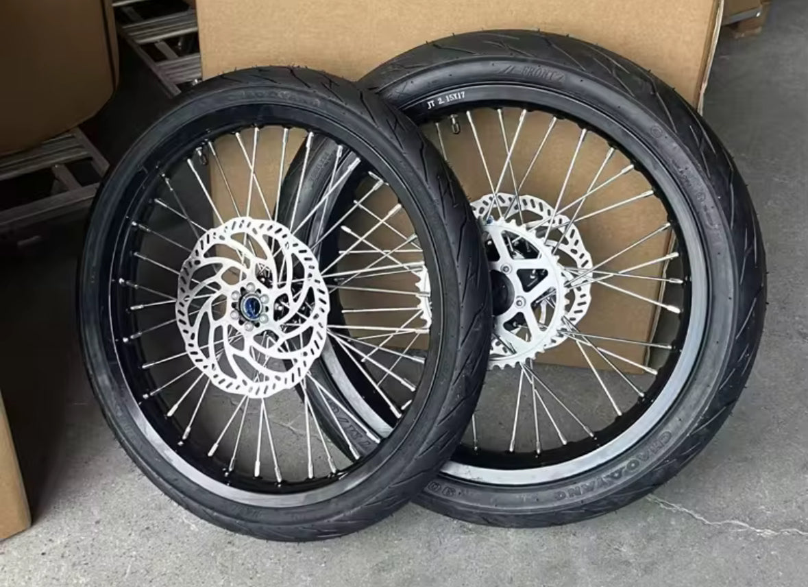 The Surron LBX Super Moto rim set is a high-quality wheel upgrade that converts your off-road e-bike into a more street-oriented supermoto. It includes a 19″ front rim and a 17″ rear rim designed to fit wider road tyres, giving you improved grip, sharper handling and greater stability on paved surfaces compared to the stock wheels. Built with strong, lightweight rims, durable hubs and stainless spokes, this set enhances both the look and performance of your bike for urban and tarmac riding.